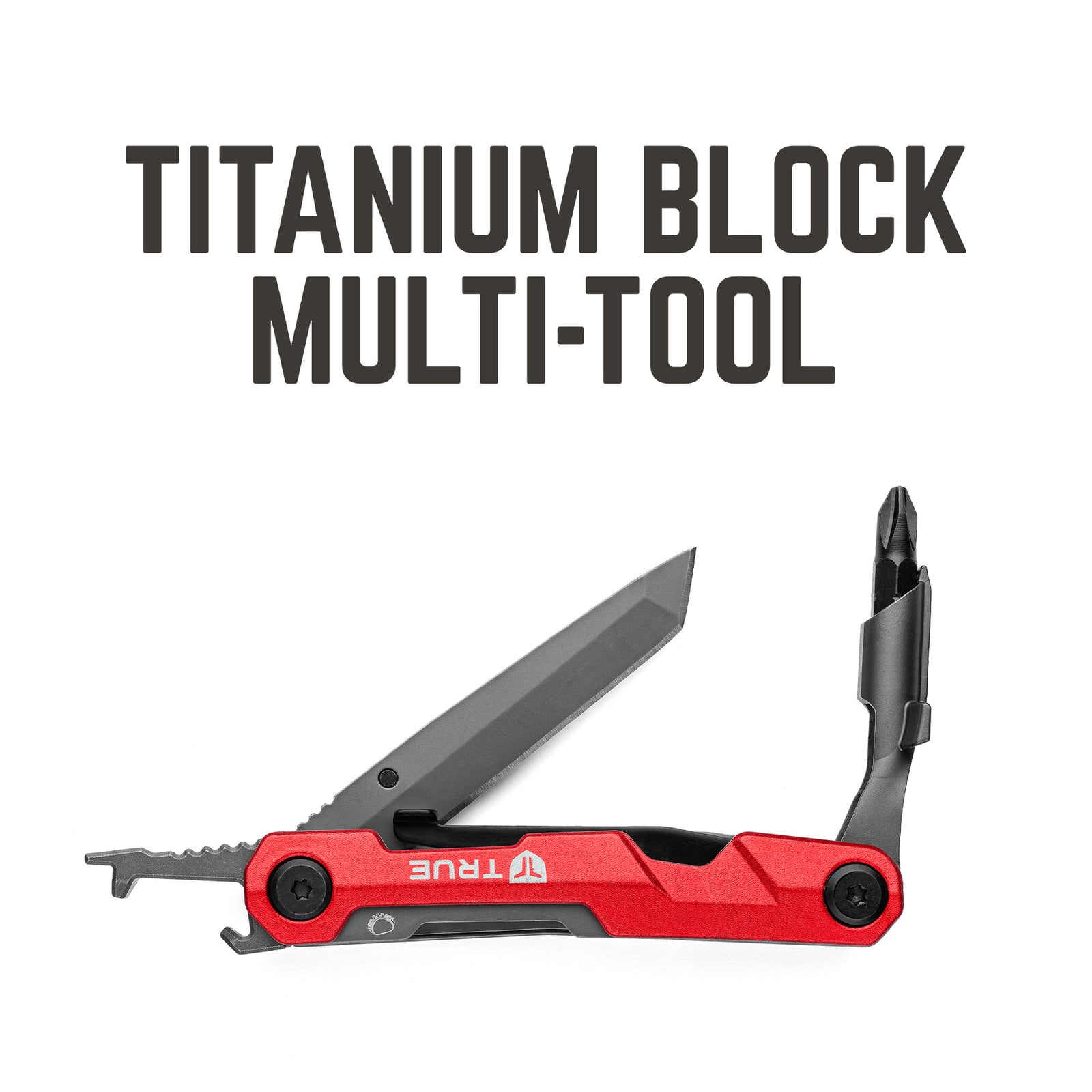 The Titanium Block Multi-Tool is equipped with a variety of useful tools: a 6.98cm tanto blade, flat edge scrapper, bottle opener, pocket clip, and a locking magnetic bit driver. The driver includes 2 interchangeable bits and features our patented Two-Position Lockout System, which locks at 90º to adapt to tight spaces and 180º for enhanced torque and performance. Each tool is coated with Titanium Nitride for increased durability and corrosion resistance.