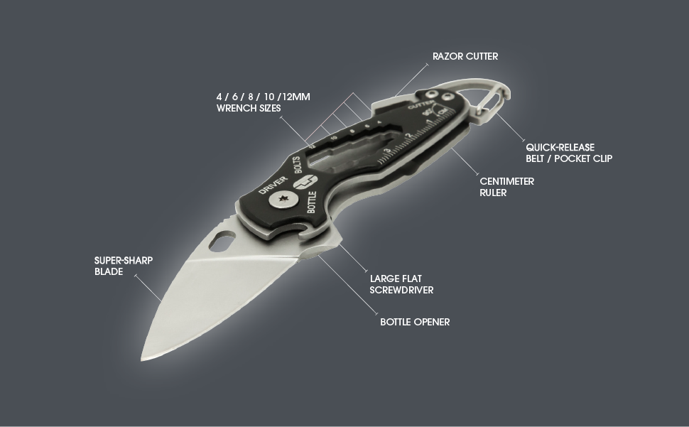 Smartknife is the knife that thinks it's a multi tool! With its quick release clip that doubles as a bottle opener. The large flat screwdriver aids one-handed opening of the blade. With an array of useful wrenches, and its built in box cutter, this tool is sure to be your most useful companion.